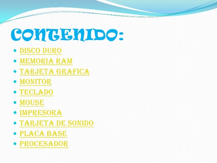 - 1. CONTENIDO: Disco duro Memoria RAM Tarjeta grafica Monitor Teclado Mouse Impresora Tarjeta de sonido PLACA BASE PROCESADOR