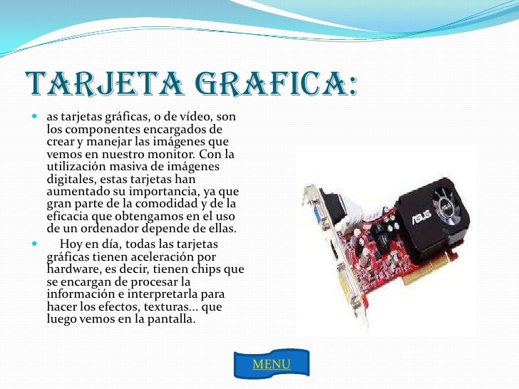- 4. TARJETA GRAFICA: as tarjetas gráficas, o de vídeo, son los componentes encargados de crear y manejar las imágenes que vemos en nuestro monitor. Con la utilización masiva de imágenes digitales, estas tarjetas han aumentado su importancia, ya que gran parte de la comodidad y de la eficacia que obtengamos en el uso de un ordenador depende de ellas. Hoy en día, todas las tarjetas gráficas tienen aceleración por hardware, es decir, tienen chips que se encargan de procesar la información e interpretarla para hacer los efectos, texturas... que luego vemos en la pantalla. MENU