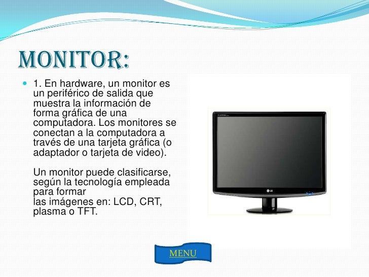 - 5. MONITOR: 1. En hardware, un monitor es un periférico de salida que muestra la información de forma gráfica de una computadora. Los monitores se conectan a la computadora a través de una tarjeta gráfica (o adaptador o tarjeta de video). Un monitor puede clasificarse, según la tecnología empleada para formar las imágenes en: LCD, CRT, plasma o TFT. MENU
