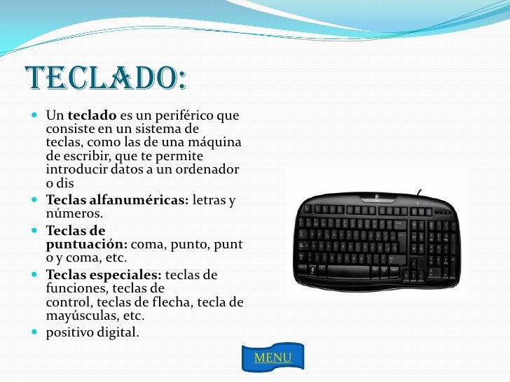 - 6. TECLADO: Un teclado es un periférico que consiste en un sistema de teclas, como las de una máquina de escribir, que te permite introducir datos a un ordenador o dis Teclas alfanuméricas: letras y números. Teclas de puntuación: coma, punto, punt o y coma, etc. Teclas especiales: teclas de funciones, teclas de control, teclas de flecha, tecla de mayúsculas, etc. positivo digital. MENU
