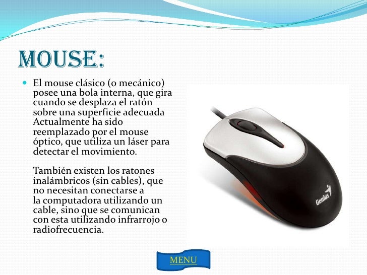 - 7. MOUSE: El mouse clásico (o mecánico) posee una bola interna, que gira cuando se desplaza el ratón sobre una superficie adecuada Actualmente ha sido reemplazado por el mouse óptico, que utiliza un láser para detectar el movimiento. También existen los ratones inalámbricos (sin cables), que no necesitan conectarse a la computadora utilizando un cable, sino que se comunican con esta utilizando infrarrojo o radiofrecuencia. MENU