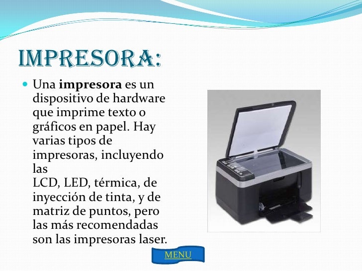 - 8. IMPRESORA: Una impresora es un dispositivo de hardware que imprime texto o gráficos en papel. Hay varias tipos de impresoras, incluyendo las LCD, LED, térmica, de inyección de tinta, y de matriz de puntos, pero las más recomendadas son las impresoras laser. MENU